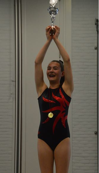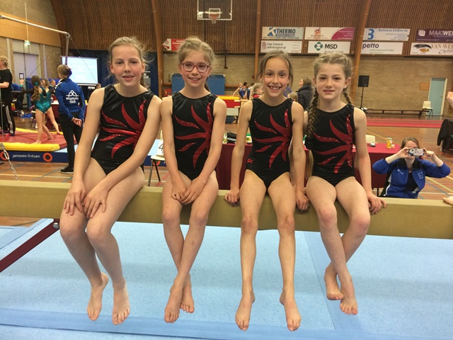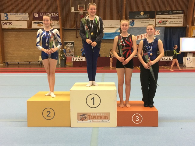 Regiofinales in Boxmeer! Zaterdag 8 april 2017 / zondag 9 april 2017 Resultaat: 4 doorstromingen naar de Districtfinales van Limburg, Brabant en Zeeland! Afgelopen weekend turnden 7 turnsters uit de A- en B-selectie hun regiofinale in Boxmeer. Op zaterdag turnden Guusje ter Laak (Jeugd 2) en Amely verhasselt (Junior) in de 4e divisie. Zij plaatsten zich al eerder voor deze wedstrijd vanuit de voorwedstrijden. Guusje startte in wedstrijd 1 sterk op vloer waar ze met mooie uitstraling turnde en een hoge salto voorwaarts deed. Haar overslagen op de sprong waren niet helemaal strak maar hadden wel een stabiele landing. Op de brug turnde Guusje vervolgens bijna alle elementen achter elkaar door met een mooie kip en hoge salto als afsprong. Als laatste had ze het toestel balk. Hier wist Guusje knap op te blijven staan en liet een stabiele radslag en pirouette zien. Dit alles resulteerde in een 11e plaats wat betekent dat ze doorstroomt naar de Districtfinale op 24 juni in Kaatsheuvel. In de middagwedstrijd begon Amely sterk op haar favoriete onderdeel brug. Ze turnde strak en alle elementen achter elkaar door met 2 kippen in haar oefening. Op balk bleef Amely netjes met de radslag staan en had ze een mooie afsprong. Op vloer landde Amely de flikflak en salto v.o. super strak. Als laatste het toestel sprong waar ze twee overslagen turnden die niet helemaal stabiel waren. Amely behaalde een 29e plaats dat niet voldoende was voor doorstroming. Wel wist ze op brug een knappe 6e plaats te behalen! Op zondag was het in wedstrijd 1 de beurt aan de meiden Instap D2 Kaate Mulders, Juni Grens en Femke van Steenveldt. In de andere baan turnde tegelijkertijd Jeugd 2 Benthe Sinel in divisie 5. Kaate liet op de brug als moeilijker element (plusje) een voorover duikelen tot hoekhang zien met mooi gespannen lichaam. Op het 2e toestel balk wist ze strak te turnen en mooi te blijven staan dat haar een knappe 7e plaats op balk opleverde. Op vloer deed ze voor het eerst een overslag in de wedstrijd en op sprong was ze in haar element met twee strakke handstand platvallen tot ruglig. In totaal werd ze 33e. Juni turnde een nette brugoefening waarbij ze voor het eerst als plusje vooroverduikelen tot hoekhang deed, super! Op balk moest ze er even vanaf maar turnden net zoals op vloer een nette oefening. Op het laatste toestel sprong wist ze twee gespannen handstand platvallen te turnen. Juni eindigde op een 35e plaats. Femke begon haar wedstrijd sterk op brug waar ze koos voor tegenspreiden af als plusje. Dit pakte goed uit met een stevige landing. Het volgende toestel balk verliep snel maar netjes. Ze bleef mooi op de balk staan. Op vloer turnde Femke vooral erg netjes en heeft een mooie overslag en boogje uitduwen gedaan. Als laatste het toestel sprong die ze met mooie lichaamsspanning uitvoerde. Voor 2x handstand platvallen kreeg ze een 13.6 waarmee ze een 5e plaats op sprong behaalde. In totaal werd Femke knap 4e waarmee ze net niet op het podium stond maar haar wel mooi doorstroming opleverde voor de Districfinale op 21 mei te Someren. Super! Benthe begon haar wedstrijd op vloer waar ze meteen als tweede aan de beurt was. Ze turnde met een goede uitstraling en mooie arabier-flikflak. Op sprong turnde ze twee knappe overslagen met plank. De brug kon ze niet helemaal doorturnen doordat ze niet goed uitkwam na de buikdraai maar kon daarna haar oefening goed hervatten met een mooie ophurken en hoge salto af. Als laatste het toestel balk, waar Benthe erg stabiel was. Zelfs de pirouette lukte en dit leverde haar een mooie 6e plaats op balk op. In totaal werd Benthe 12e dat genoeg was voor een doorstroming naar de districtfinale op 24 juni in Kaatsheuvel. In de tweede wedstrijd van die dag turnde Junior 5e divisie Kim Lemmen haar wedstrijd. Het was erg spannend maar ze startte op het toestel balk waar ze meteen de toon zette voor een goede wedstrijd. Alles lukte en met een mooie radslag-salto af wist ze een 2e plaats op balk te behalen. Op het toestel vloer was ze nog even in twijfel of ze een achteruitsalto achter de arabier-flikflak zou gaan doen maar net voor de wedstrijd besloot ze dit toch te proberen. Dit was een prima keuze want hij lukte en ook de salto voorover landde ze stabiel. Op het toestel sprong deed ze twee mooie half in - half uit sprongen. Als laatste het toestel brug waar het even mis leek te gaan bij het ophurken maar ze turnde alles mooi door en ook na de pendelkip kwam een hoge wegzet voor de salto met stevige landing waarmee ze een 9e plaats behaalde. Bij de prijsuitreiking was het spannend.. en wat bleek: Kim eindigde als 3e en mocht daarmee het erepodium beklimmen. Ze kreeg een mooie bronzen medaille en plaatst zich hiermee voor de Districtfinale op 24 juni in Kaatsheuvel. Wat een knappe prestaties meiden. Wij zijn trots op jullie en wensen de meiden in de aanloop naar de Districtfinales veel succes! |