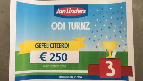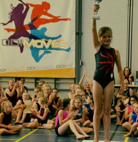 Valkenswaard Het was weer een druk wedstrijdweekend voor turnsters van ODI Turnz. Dit weekend stonden de regiofinales voor de deur. De meiden die zich hiervoor geplaatst hadden mochten turnen tegen de beste turnsters uit de regio. Zaterdag 24 maart, Divisie 4 en D1 Vroeg in de morgen, in wedstrijd 1 was het de beurt aan jeugd 1 D1 turnster Cato. Op brug begon ze stabiel door een mooie doorgeturnde oefening te laten zien. Op balk turnde ze een mooie handstand en stabiele sprongenserie. Echter lukte het haar niet om met radslag en fouetédraai op de balk te blijven staan. Vervolgens turnde ze sierlijk op vloer waar ze een nette dubbel flikflak liet zien en een wijde wisselspagaatsprong. Op de sprong kostte het met inturnen wat moeite maar lukte het Cato om tijdens de wedstrijd 2 half in – half uit sprongen te laten zien. Met sterke tegenstanders was het moeilijk om in de top te eindigen maar Cato mag vol trots zeggen dat ze 20e van regio Brabant-Oost is geworden. In wedstrijd 2 was het de beurt aan de junioren 4e divisie. Guusje, Amely en Sara hadden zich hiervoor geplaatst. Omdat Sara anderhalve week voor de wedstrijd een blessure opliep kon ze de wedstrijd helaas niet mee turnen. Wel ging Sara mee als coach en mocht Christel die als reserve stond, in haar plaats turnen. De wedstrijd begon op brug waar de meiden erg tevreden waren over hun kippen aan de lage en hoge ligger. Amely kon daarnaast haar oefening helemaal doorturnen en Guusje en Christel hadden een mooie salto af. Op balk wist Guusje mooi te blijven staan en lukte ook haar radslag en pirouette netjes. Amely turnde een mooie sprongenserie en landde haar salto af stabiel. Christel lukte het om haar sprongenserie netjes achter elkaar te turnen en had een hoge salto af. Op vloer wist Guusje vervolgens een wijde wisselspagaatsprong te turnen en een mooie arabier-flikflak-salto met stabiele landing. Amely landde haar voorover salto netjes tot stand en wist een extra verbindingswaarde te behalen door spagaatsprong halve draai met een streksprong hele draai te combineren. Ook Christel behaalde een hoge D-score (moeilijkheidsgraad) door verschillende moeilijke sprongen te combineren. Zo deed ze voor het eerst pirouette direct gevolgd door een streksprong hele draai. Daarnaast wist ze een mooie arabier-flikflak en Johnson te laten zien aan de jury. In totaal eindigde Amely op de 22e, Guusje op de 23e en Christel op de 35e plaats. Zondag 25 maart, Divisie 5 en D2 In wedstrijd 1 was het de beurt aan de instappers D2 Jill, Manou en Lizzy. De wedstrijd begon op het toestel brug waar de meiden mooie doorgeturnde oefeningen lieten zien. Lizzy en Jill waren daarnaast trots op hun hoge zwaaien en Manou op de hoekhang die ze ruim 3 sec. wist vast te houden. De wedstrijd vervolgde zich op het toestel balk waar Manou en Lizzy mooi op wisten te blijven staan. Beiden turnden een mooie zweefstand. Jill moest helaas de balk een keer verlaten maar turnde een mooie halve draai op 1 been en een stabiele hoekzit. Op het toestel vloer liet Manou een mooie arabier met kaats en stabiele landing zien. Lizzy turnde vooral erg netjes en was tevreden met het aanhouden van een mooie ligsteun. Jill turnde een mooie overslag met stabiele landing. Op het laatste toestel sprong turnden de meiden voor het eerste met de eindhouding in een ‘kommetje’. Door snelle benen, strakke tenen en lichaamsspanning te behouden bij de landing wisten ze hoge punten te behalen. In totaal behaalde Lizzy een 5e plaats, Jill een 23e plaats en Manou een 29e plaats. Of een 5e plaats voldoende is voor doorstroming naar de districtfinale wordt later op de website van de KNGU bekend gemaakt. In wedstrijd 2 mochten pupillen 1 D2 Jara en Emma de Vries en Junior divisie 5 Benthe hun wedstrijd turnen. Op brug wisten alle meiden hun oefeningen door te turnen. Benthe eindigde met een hoge salto en stabiele landing. Emma lukte het mooi om het plusje ophurken te turnen en Jara had een mooie hol-bol beweging aan de hoge ligger. Op het toestel balk turnde Benthe een wijde spagaatsprong in haar sprongenserie en wist met de handstand haar benen hoog op te gooien. Echter met de pirouette moest ze de balk even verlaten. Emma wist handstand en koprol vandaag stabiel te turnen. Door uit te komen in hurkzit na de koprol kreeg ze extra punten voor de moeilijkheid. Jara turnde een stabiele loopsprong-assemblé-streksprong en een hoge handstand maar lukte het niet om bij de koprol op de balk te blijven. Op het toestel vloer vergat Benthe de pirouette maar voerde haar oefening uit met goede uitstraling en deed een arabier-flikflak en nette handstand-doorrol. Jara turnde stabiele sprongen en mooie koprol achterover. Ook Emma was tevreden over haar koprol a.o. en de sluitoverslag met kaats. Het laatste toestel sprong was vooral voor de pupillen een makkie. Met een vlotte handstand-platval tot ruglig in ‘kommetje’ wist Emma een 4e plaats op sprong te behalen en Jara zelfs een 1e plaats. Benthe turnde twee overslagen met plank met klein stapje bij de landing. Uiteindelijk wist Emma een 14e plaats te behalen en Jara eindigde op de 18e plaats. Benthe werd in haar wedstrijd 35e. In wedstrijd 3 was het de beurt aan pupil 2 D2 Emma Verberk. Emma begon haar wedstrijd sterk op sprong. Met veel en snelheid wist ze twee mooie overslagen over de kast te springen. Op het toestel brug turnde ze haar gehele oefening mooi door met ophurken en hoge zwaaien aan de hoge ligger. Op het toestel balk wist Emma voor het eerst in een wedstrijd het plusje radslag mooi tot stand te turnen. Ook had ze stabiele sprongen. Helaas lukte het met de handstand net niet om op de balk te blijven staan. Als laatste het toestel vloer waar Emma alle plusjes wist te turnen. Ze deed voor het eerst streksprongen hele draai. Daarnaast was haar overslag-radslag mooi doorgeturnd. Emma eindigde in een sterk deelnemersveld op een 26e plek. Alle meiden die afgelopen weekend geturnd hebben mogen trots zijn dat ze bij de besten van de regio horen. Het niv