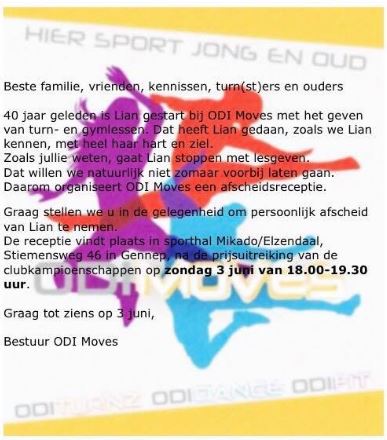 Afscheid Linda Schook Zaterdag 14 oktober was de laatste turnles van Linda Schook. Ze werd 10 jaar geleden lid van ODI als turnster en heeft zich daarna 8 jaar fanatiek ingezet als hulpleiding. Naast haar vaste aanwezigheid in de recreatiegroepen op zaterdag was ze altijd bereid om te helpen bij evenementen. I.v.m. een druk leven op veel andere gebieden heeft ze besloten om te stoppen als hulpleiding. Linda bedankt voor je fantastische inzet en veel succes met je school, stage en werk! Wij en de kinderen gaan je zeker missen! |