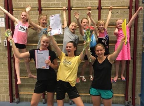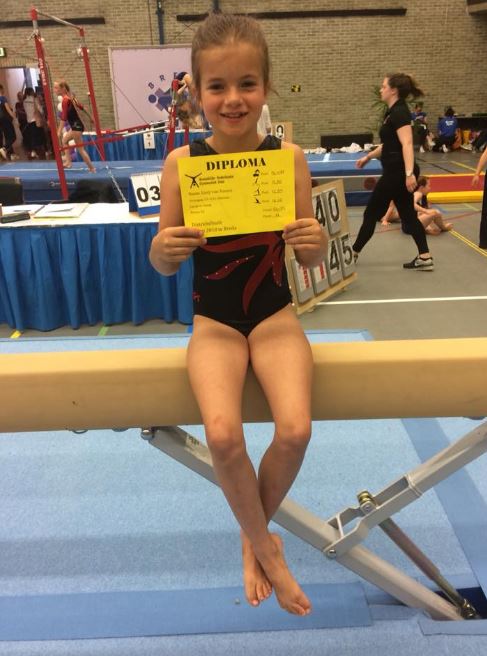 Zuid-Nederland in Breda Naast vorige week de titel clubkampioen in de wacht gesleept te hebben, mocht Lizzy vandaag nog een keer haar oefeningen turnen op de Districtfinale van Zuid-Nederland in Breda. De beste turnsters van Limburg, Brabant en Zeeland stonden al vroeg klaar om te laten zien wat ze in hun mars hadden. Lizzy begon stabiel op de brug met hoge zwaaien en een strakke hoekhang en wist haar oefening mooi achter elkaar door te turnen. Op balk wist ze te blijven staan en turnde hoge sprongen en een handstand. Het 3e toestel was de vloer, hier had ze enkele wiebels en vergat ze bijna haar radslag maar kwam hier op tijd achter om dit nog te corrigeren. Ook liet ze een mooie overslag met plank zien. Als laatste het toestel sprong, waar ze 2x mooi strak via handstand tot ruglig vloog. Bovenstaande resulteerde in een super mooie 11e plaats! Wij zijn trots Lizzy! Erg knap gedaan. Dit was voor de selectieturnsters de laatste wedstrijd van het seizoen. We gaan nog een aantal weken lekker trainen waarna de welverdiende zomervakantie van start kan gaan. |