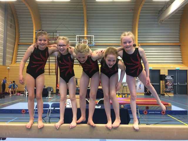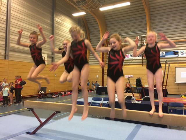 Alle turnsters turnden 2 of 3 toestellen zodat er op ieder toestel in totaal 3 oefeningen geturnd werden. Deze vormden samen het teamtotaal. De meiden hebben mooi geturnd en er een sportieve en gezellige wedstrijd van gemaakt. |